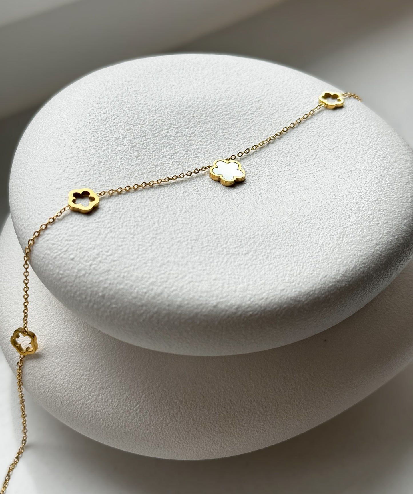 Die elegante Lucy Halskette aus Edelstahl hat in der Mitte einen schicken weißen Kleeblatt-Anhänger aus Perlmutt. An der Kette befinden sich ebenfalls kleine Kleeblätter. Die goldene Farbe sorgt für einen attraktiven Touch, während die Länge von 40 cm mit einer zusätzlichen Verlängerung von 5 cm für flexible Tragbarkeit sorgt.
